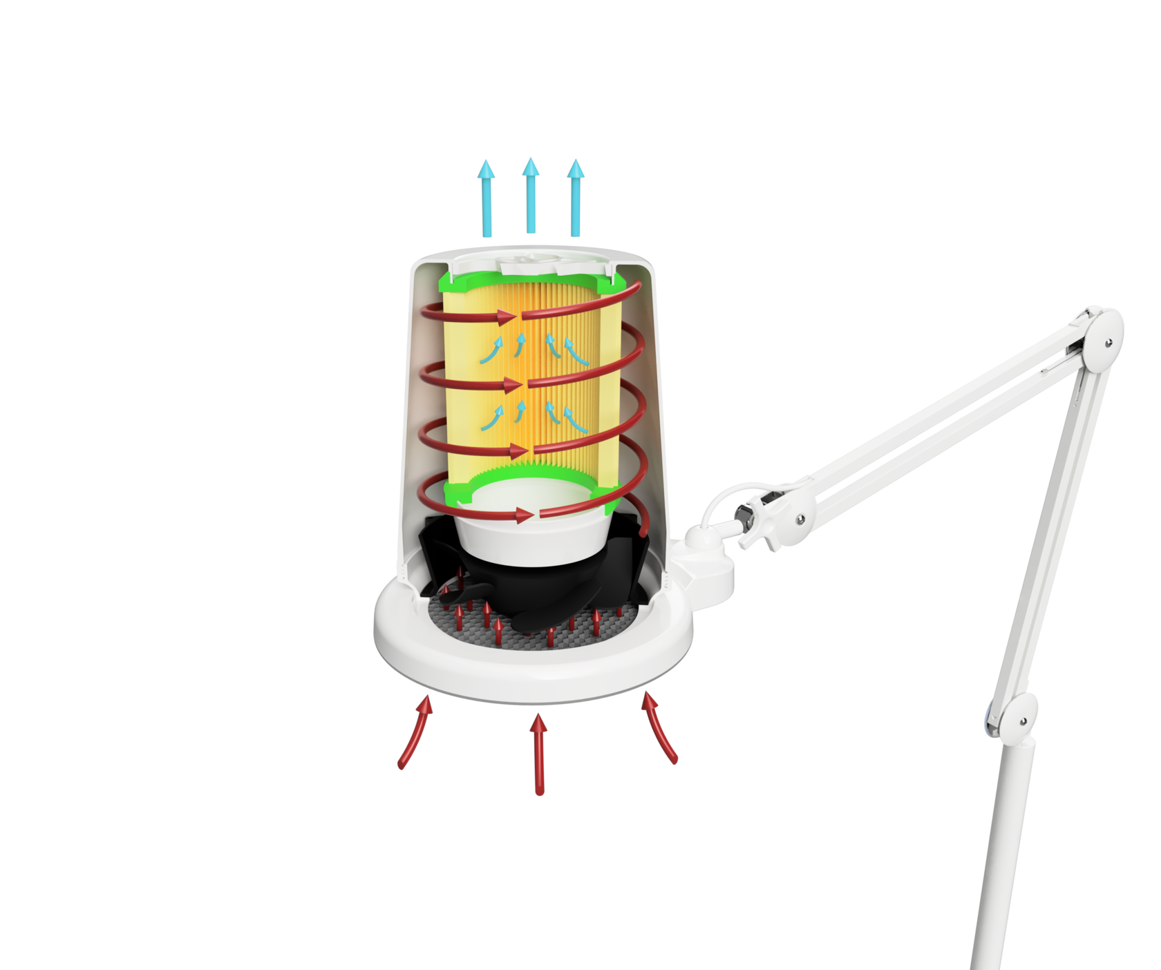 Благодаря сверхсильному двигателю и запатентованной форме лопастей вентилятора, воздушный поток закручивается, создавая эффект "циклона", таким образом происходит двойная очистка: